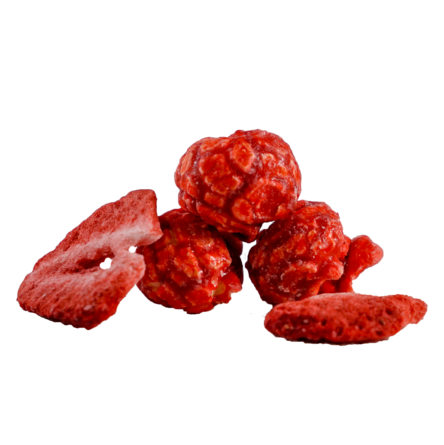 Ingredients: Popcorn, Dehydrated Strawberries, White Chocolate (Sugar, Partially Hydrogenated Palm Kernel Oil, Whole Milk Solids, Reduced Mineral Whey Powder, Nonfat Dry Milk Solids, Soy Lecithin, Salt, Artificial Flavor), Strawberry Flavoring (Dextrose, Artificial Flavor, Red #40, Blue #1), Coconut Oil, Sugar, Soy, Soybean Oil, Soybean Lecithin, Salt, Artificial Flavor, Riboflavin.